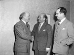 Eugene Ormandy, conductor of the Philadelphia Orchestra, center, to appear here Thursday night, is welcomed to Fort Worth by Mayor Roscoe Carnrike, left, and Council man Malvern Marks, president of the Civic Music Association. The three men are dressed in suits and ties. Malvern Marks is wearing eyeglasses and has his left hand in the pocket of his blazer. They are shown standing in front of a wall. Mayor Carnrike is shaking hands with Eugene Ormandy. All are smiling. Published in the Fort Worth Star-Telegram evening edition, May 16, 1946.