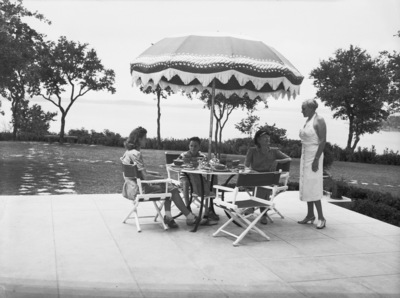 Gathered on the terrace of the Marshall H. Kennady home on Eagle Mountain Lake are, left to right, Frances Patton, Nicholas Kennady, Mrs. Normand K. Patton and, standing, Mrs. Marshall H. Kennady. Frances, Nicholas and Mrs. Patton are sitting at an umbrella-protected table. On the table are several plates and bowls. Frances, Mrs. Patton and Mrs. Kennady are wearing dresses. Nicholas is wearing a shirt and trousers.