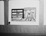 Gathering Eggs, a painting is shown here. Petra Ortega, 9, a second grade student at Katy Lake, won a special award in the children's art exhibit in the gallery of the Public Library for his colorful water color. The painting is of two children, one girl and a boy, wearing shirts and overalls, holding baskets to gather eggs are walking towards a chicken coop. Published in the Fort Worth Star-Telegram morning edition, May 19, 1946.