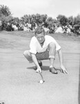 Golfer Harry Todd, Dallas, Texas, is pictured here. He is shown crouched at a golf course in his golf attire while holding a golf club in his right hand and resting his left hand on the ground. He is ready to make his putt. His seventy one (71) was among the low scores for opening round of the Colonial Invitation Thursday. Published in the Fort Worth Star-Telegram evening edition, May 17, 1946.