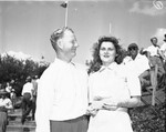 Jimmy Hines, one of the two players to better par during second day of Colonial's big golf tournaments, chats with his wife after carding of 67. She watched his every shot. Both are standing at a golf course. He is in his golf attire while his wife is wearing a collared dress. She is holding a golf-card and a pencil. There are few people in the background. Published in the Fort Worth Star-Telegram morning edition, May 18, 1946.