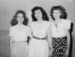 Texas Wesleyan College (TWC) freshman class elected its sophomore year officers for 1946-1947. Three officer are pictured here. They are from left to right, Secretary Penta Jo Price of 3416 W. 6th Street, Fort Worth, Texas; Reporter Betty Jane Turney of 3951 Lisbon, Fort Worth, Texas, and Vice President Mary McLeod of Eunice, New Mexico. Three girls are standing in front of a wall posing for the camera. Penta Jo Price and Mary McLeod are wearing skirts and blouses and Jane Turney is wearing a dress, a necklace and a bracelet on her left hand. Mary is wearing a bracelet on her left hand. Penta Jo is the college drum major and Mary is one of the majorettes. Published in the Fort Worth Star-Telegram evening edition, May 20, 1946.