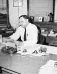 J. G. Brannon, division superintendent of Texas & Pacific Railway is pictured here. He was on a train en route to Fort Worth when President Truman ordered the office of Defense Transportation to take over the roads. Mr. Brannon came to his office to find the first-hand reports of government seizure awaiting him. He is shown seated at his office desk and reading the report. He is wearing eyeglasses and dressed in full sleeved shirt and tie. There is a variety of office stationery on the table such as papers, paperweights. Behind him is a table with picture frames, a candlestick telephone. Published in the Fort Worth Star-Telegram morning edition, May 17, 1946.