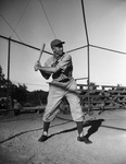 Asa Short joined the Worth Clothiers' nine in the Major City League. For the past three weeks, Short drove in at least one run in every game and is batting at a.400 clip. The catcher has been one of the city's leading sandlot players for the past four years. Short is standing in the right-handed batter's box, awaiting his pitch. He is dressed in the Clothier uniform consisting of a hat, jersey with piping down the front, baseball pants, stirrups and cleats. Behind the backstop and down the third base line are the bleachers.