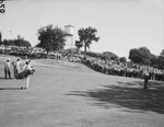 Harry Todd's long putt for birdie stopped short on No. 18 green Saturday as the huge gallery held its breath. He stroked in the next one for a par four to finish with 70 and take the 54-hole lead with a 211 total. Far left is Herman Barron and Bob Hamilton standing a few feed beyond cup. The hill is lined with spectators. Published in the Fort Worth Star-Telegram morning edition, May 19, 1946.