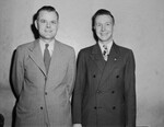 Jack Carter, left, attorney who resigned as county Democratic chairman, announced his candidacy for state Senate. He is one of seven men seeking the place now held by Jesse E. Martin. Brantley Pringle, 27-year-old attorney, was elected by the County Democratic executive committee to success Carter in office. Pringle has been associated in law practice with L. J. Wardlaw, state Democratic committeeman from this district, since returning from Navy service last November. new county Democratic chairman. Both men are standing in front of the wall wearing suits and smiling for the camera. Published in the Fort Worth Star-Telegram morning edition, May 19 and May 21, 1946.