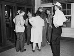 Engineers stand close by a phone booth at the Texas and Pacific Station awaiting word of the postponement of the rail strike before taking other trains out. Passengers crowd near the engineers, also anxiously awaiting the news. Published in the The Fort Worth Star-Telegram morning edition, May 19, 1946.