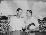 Ben Hogan, right, chats with Harry Todd, after stroking the putt that won the Colonial Invitation golf tournament Sunday. Hogan carded a 65 on the final day to finish with a 279. Todd was second with a 280. There two men are standing at the golf course with crowds behind them at a distance. Ben is holding a cigarette and a in his left hand and has his right hand on Harry's shoulder. Published in the Fort Worth Star-Telegram morning edition, May 21, 1946.