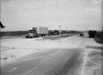 Wheat rolled into Fort Worth in 450 bushel trucks on Monday. These are some of the trucks which waited on Highway 81 before unloading the grain at the Burrus Mill and Elevator Company. The highway seems deserted expect for the trucks waiting in a line on one side of the road. There are electric posts and fields on the either side of the road. Published in the Fort Worth Star-Telegram evening edition, may 20, 1946.