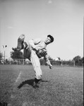 South Paw Bob Page hurled his seventh schoolboy baseball victory for Amon Carter Riverside Monday, will shoot for No. 8 against Technical Tuesday. His image was captured while he was in action, ready to make a throw in a baseball field. He is in his baseball attire wearing baseball cleats, cap and a glove. Published in the Fort Worth Star-Telegram morning edition, May 21, 1946.
