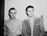 San Antonio Missions, left to right, Jim "Chick" Lucas and Ned Garver. Lucas is a left-handed hitting shortstop and third basemen. He is dressed in a button-up shirt with cuffed sleeves. Garver is a 20-year-old right-handed pitcher. He is wearing a dress shirt and a sport coat.