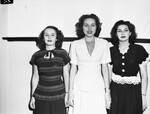 The names of the 1946 Smile Girl, the class beauties, and the person to whom the book is dedicated were revealed Friday when the Texas Wesleyan College (TWC) student year book, the "Txweco" was distributed. It was the largest ever yearbook published by the school and is dedicated to Professor F. R. Matthis. Editor of the annual was Doris V. Tolan, assisted by Betty Findley, both of Fort Worth. The beauties of the year are left to right, Stella Green, Fort Worth, Texas, freshman; Elizabeth Hasley of Washington, District of Columbia (D. C.), junior, and Carolyn Clarke, Ranger, Texas, sophomore. All three girls are standing in front of a wall smiling for the camera. Published in the Fort Worth Star-Telegram evening edition, May 24, 1946.