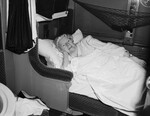Mrs. Margaret Burke, 77, of Detroit, Texas, smiles from her berth. She is one of the stranded passengers in the railroad strike who was accommodated in a Pullman set up by the Texas and Pacific Station. The strike interrupted her trip home after an operation performed at Tucson, Arizona. She is covered in blankets and is wearing a watch on her left hand. Published in the Fort Worth Star-Telegram evening edition, May 24, 1946.