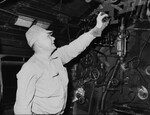 J.B. Britt of Dallas, fireman on the T&P Texan, cut off the steam at 4:20 p.m. Thursday at the station here. Engineer of the train, which arrived at 3.30 p.m. from El Paso, walked out of the cab, at 4 p. m. on strike and the train did not proceed east from Fort Worth. Britt is standing in front machinery that includes calibration scales, knobs and wires. He is wearing a shirt, a hat, a glove and eyeglasses. Published in the Fort Worth Star-Telegram morning edition, May 24, 1946.