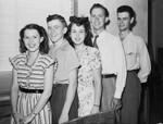 Wanda Woodward, Ben Feemster, Geraldine Redmond, Fred Dunlap and Elvin Nabors, left to right, started in kindergarten together, will graduate together at Polytechnic High School. All of them are standing in a line and angled to face the camera. Publsihed in the Fort Worth Star-Telegram evening edition, May 26, 1946.