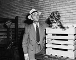 Mike, a year old Cocker Spaniel was on his way to Wichita Falls, but was stuck at the Texas & Pacific Station until the trains start moving. Meantime, the Railway Express will see that he is watered, fed and exercised. He is standing in a crate next to an unidentified person. Published in the Fort Worth Star-Telegram morning edition, May 25, 1946.