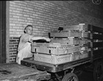 E. R. Taylor, 936 E. Annie Street, inspects a few of the thousands of day-old chicks stranded during the railroad strike at Texas and Pacific Station. He is standing front of a cart containing cartons of baby chicks. He is wearing an apron and eyeglasses. Published in the Fort Worth Star-Telegram morning edition, May 25, 1946.