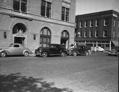 Shot of Throckmorton Street in Fort Worth, Texas, showing the Telephone Company building in the background. Three cars are parked behind each other in front of the building. Further down the street is another large building for the Texas National Guard. A few people are walking on the street.