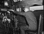 James M. Wylie of Cleburne, Texas, headed the "back-to-work" movement among striking engineers on Saturday. Here, he pulls open the throttle to start the Santa Fe Antelope on its journey to Kansas City. The train departed at 6.45 p. m., almost two hours before the next passenger coaches left the city. Wylie is wearing his uniform and is sitting in the engine room. In front of him is the machinery. Published in the Fort Worth Star-Telegram evening edition, May 26, 1946.