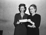 Mrs. Heard Floore (left), secretary of the Fort Worth Children's Hospital board, receives a check for $47.52 from Miss Ann McGlinchey, of the Woman's Traffic Club, to be applied on the hospital's laboratory fund. The club, which donated its commission on flower show ticket sales, also contributes monthly to the hospital's milk fund. Both women are standing on front of a wall and are holding the check, as they pose for the camera. They are wearing hats. Mrs. Floore is wearing a blazer and Ms. McGlinchey is wearing a dark-colored dress and a pearl necklace. Published in the Fort Worth Star-Telegram evening edition, May 25,1946.