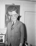Louis S. Cates of New York City, New York, president of the Phelps Dodge Corporation, declared that Office of Price Administration regulations had resulted in a copper mining strike of more than 16,000 workers and had cut off 65% of copper production in the United States. In the image, Cates is standing in a room wearing a suit and a hat, smiling. There is a huge poster of a man's face hanging on the wall behind him. Cates, who is the president of American Institute of Mining and Metallurgical Engineers, leveled his charges against governmental restrictions during an interview as he spoke Tuesday night in Hotel Texas at a dinner meeting of the North Texas Section of the Petroleum Division of the Institute. Published in the Fort Worth Star-Telegram morning edition, May 29, 1946.