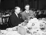 Galen H. McKinney, right, a division chairman in the $3,000,000 Texas Christian University building fund campaign, and W. Steve Cook, member of one of the business men's campaign committees, look over prospect lists. Both men are sitting at the dining table and are holding envelopes in their hands. There is a placard on the table with the words "Division D" written on it. They are sitting in what seems to be an unoccupied banquet hall. There are slices of cake, crackers, dessert bowls on the table. Published in the Fort Worth Star-Telegram morning edition, May 28, 1946.