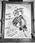 Copy of Hal Coffman cartoon showing Byron Foy riding a bucking bronco. In the cartoon Byron is flying of the horse that is running really fast and he says "Haven't you something a bit less violent". Also written on the carton is " Ride 'Im Cowboy! Byron Foy from Dallas Tries the Higher Altitude of Fort Worth(with the aid of the horse) Where the west Begins!!!"