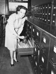Ida Carlton, a Fort Worth Star-Telegram employee is reenacting an embarrassing story from a week earlier. Reverend J. Frank Norris is looking over her shoulder as she was pulling files. She opened the first filing cabinet and found a near empty jug of "Old Erie" labeled "JRR". Mrs. Carlton is wearing a button-up dress. There are rows of filing cabinets on each side of her. She has one drawer open and is holding the mysterious jug.