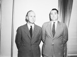 L. F. Peterson, left, division engineer, Stanolind Oil and Gas Company, Fort Worth, Texas; and H. K. McKinnon, Shell Oil Company, Incorporated, Midland, Texas, were present at the American Institute of Mining and Metallurgical Engineers dinner meeting. Both men are wearing suits and are standing in front of a bare wall.
