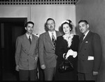 Lone Star Chapter 3004, Independent Order of Foresters, was installed with 66 members as one of the newest chapters of the international fraternal organization Tuesday night during a special installation program at Midway Inn. Left to right are Stuart Wasser, Louis Probst of San Francisco, California, an unidentified woman and Frank Rainone. Probst installed the new officers. All men are in their suits and the woman is wearing a dress, gloves, hat and is holding a purse in her hands. They are standing in front of a wall. Published in the Fort Worth Star-Telegram morning edition, May 29, 1946.