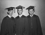 International unity and the brotherhood of all men if whatever nation were goals stressed by honor student speakers at commencement exercises Tuesday night for 76 graduates of Amon Carter Riverside High School. The United Nations theme was carried out in an address on "Roads America May Travel," by Miss Ruth May, and in "Toward World Citizenship," by James Browne. Three graduates who have entered Riverside Elementary School in 1933 and have gone from class to class since then, were honored. From left to right are Hartsell Wallace, son of Mr. and Mrs. A. L. Wallace; Floyd Benson, son of Mrs. Sally Benson, and Lawrence Coursey, son of Mr. and Mrs. J. L. Coursey. All three men are standing in front of a wall wearing graduation robes and smiling for the camera. Published in the Fort Worth Star-Telegram, May 29, 1946.