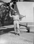 Lieutenant Colonel Benjamin F. Witsell headed the flight of 19 helicopters serviced at Fort Worth Army Air Field Tuesday morning. Lt. Col. Witsell is wearing his uniform and is standing at an airfield next to a helicopter. There is a mechanic in the helicopter cockpit. Published in the Fort Worth Star-Telegram evening edition, May 28, 1946.