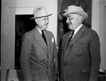 Left to right, Amon Carter and Louis S. Cates, New York. Both men are wearing a suit and tie with hat, They are standing in front of a closed door. They are looking at each other and smiling. Mr. Cates was the president of Phelps Dodge Corporation and American Institute of Mining and Metallurgical Engineers.