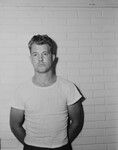 Thomas Newell McGuffey, 22, Wednesday, was returned to Fort Worth, Texas from Greenville, Texas and held without bond after being charged with the fatal stabbing May 19 of Aaron Jackson Stallons, 22. McGuffey was a Greenville railroad section gang worker. McGuffey was charged with Stallon's slaying after a report from the Department of Public Safety showed that flakes of gold paint in a knife sheath in McGuffey's car were of the same type as those on the knife blade broken off in the slain man's skull. The body of Stallons was found in Denton Creek northwest of Grapevine. In the image, McGuffey is wearing a T-shirt and is standing in front of the wall. Published in the Fort Worth Star-Telegram morning edition, May 30, 1946.