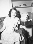 Sandra Canning, recent Paschal High School graduate, won the $25 third place prize in the nationwide safety poster contest of the American Legion. She is shown sitting on a chair and wearing a dress with a ruffle on the front. Behind her is a shelf and table on which there are various books and figurines. Miss Canning is the daughter of Mr. and Mrs. J. F. Canning.