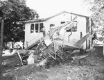 Wrecked plane that ripped through large trees and landed 10 feet from the home of Mr. and Mrs. J. S. Elkins, 810 Ash Crescent. The pilot, James Ray Hicks, 16, was killed in the crash. Standing on a flight of stairs on the side of the house is an unidentified man. Around the house are several trees.