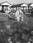 J. L. Buzbee, night watchman, points to a hole made by a practice bomb that fell from an airplane on the north side, the day of the Air Show. Mr. Buzbee is wearing a hat, a button-up shirt, necktie, and trousers. He is kneeling next to the hole. There are houses in the background and people sitting on their porches. The homes are of a "shotgun house" style and the people are African Americans.