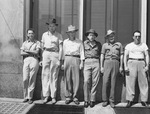 Fort Worth Star-Telegram employees, delivered papers during rail strike. Left to right: W. C. Tripp, H. C. Beck, G. F. Lasater, Jack Huffman, Tommy Fitzpatrick, Willard Brock. The rail strike proved no handicap from a service standpoint. Papers to dealers and subscribers were delivered on time. Mr. Trip is wearing a button-up shirt with the sleeves rolled-up. Mr. Beck is wearing a hat, a cuffed button-up shirt, and cowboy boots. He is smoking a cigarette. Mr. Lasater is wearing a hat and a dress shirt. Mr. Huffman is wearing a cowboy hat, a western shirt, and cowboy boots. Mr. Fitzpatrick is dressed in a cowboy hat and a cuffed button-up shirt. He is also smoking a cigarette. Mr. Brock is wearing a Star-Telegram t-shirt tucked into his trousers, and cowboy boots.