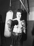 Tom Attra, boxer, standing beside a punching bag. He is wearing athletic shorts and boxing gloves. The label on his shorts reads "Boxing Spalding Equipment." In the background is a ladder.