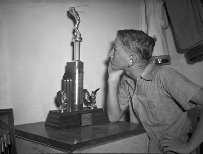 Gene Smyers, a contender in the Fort Worth, Texas, junior golf tournament at Rockwood Park, is looking at the President's Trophy that was awarded to a golfer the previous year. Smyers has his right arm on the table that the trophy is on, and he is leaning on the table. He is wearing a short-sleeve collared shirt.