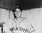 Leo Hatley is a pitcher for the Oklahoma City Indians. His is sitting in the visiting dugout at LaGrave Field, wearing the Indians' road uniform.