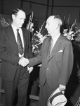 B. L. McRae, left, shaking hands with Henry Young, right. Mr. McRae is wearing a dark suit with a paisley necktie. Mr. Young is wearing a suit with a handkerchief in his pocket. He is holding a light-colored hat. There are flowers on the table behind the men.