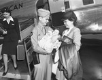 Captain and Mrs. Robert Livingston and their 10-week-old daughter, Susan Livingston, at Municipal Airport. They are standing in front of the plane and Captain Livingston is holding his daughter. At far left is an unnamed woman holding a suitcase and walking down the ramp exiting the plane. Mrs. Livingston and Susan arrived from California to join Captain Livingston, who was transferred to Fort Worth, Texas Army Air Field as a statistical officer. He wears the Purple Heart and was a prisoner of war of Germany. He is wearing his military uniform, Susan is swaddled in a blanket, and Mrs. Livingston is wearing a hat, eyeglasses, coat, and is holding luggage items.