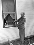 Swackhamer slaying. Bob Vance is standing outside of the house where the homicide took place. He is inspecting the broken window screen that leads to the kitchen. Mr. Vance is wearing a coat and trousers. He has a cigar in his hand.