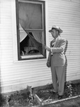 Swackhamer slaying. Sheriff W. J. Tuck is standing outside of the house where the homicide took place. He is inspecting the broken window screen that leads to the kitchen. Sheriff Tuck is wearing a hat and a light-colored suit.