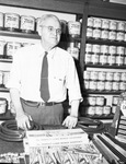 A. L. Barton, a retired postal clerk, standing behind the counter at his son's hardware and electrical appliance store. Mr. Barton began working at his son's store two days after retiring from 30 years' service in the Post Office Department of Fort Worth, Texas. He is wearing a collared shirt, necktie, trousers, and eyeglasses. On the counter and on the shelf behind him are various hardware tools and supplies.
