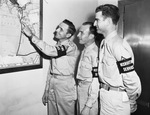 Sergeants L. M. Brown, G. W. Slate, and R. L. Morrow (left to right), all of the Army recruiting office in Fort Worth, Texas, locate on a map hanging on the wall the place where they were captured as members of the "Lost Battalion" in Java in 1942. They are wearing their military uniforms and armbands that read "Recruiting Service." Sergeant Brown is pointing to a place on the map.