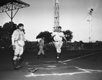The Fort Worth Cats opened a series against the Tulsa Oilers Thursday at LaGrave Field. The Cats' first basemen Lou Ruchser strode home with the first run in the bottom of the first inning. The Oilers' catcher is standing behind home. Number 3 for the Oilers is standing up the third base line.