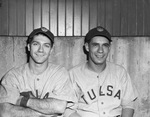 The Tulsa Oilers are the Minor League affiliate to the Chicago Cubs. Two of their players, left to right, are Henry Schenz and Tommy Warren. Third basemen Schenz is the league's leading hitter. He has arms folded over his baseball glove. Warren is Tulsa's ace. He will take the hill in game two at LaGrave Field against the Cats' pitcher Eddie Chandler. Both men are standing against a wall, dressed in their Oilers' uniforms.