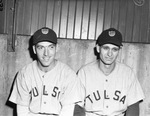 The Tulsa Oilers were in town for a series against the Fort Worth Cats. Two of their players are, left to right, Andy Steinbach and Mack Stewart. Steinbach, 26, is a switch hitting pitcher. Stewart is a 31-year-old right-handed pitcher. They are sitting in the dugout, wearing Tulsa's road uniform.